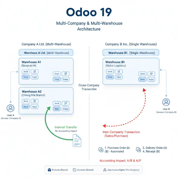มาทำความเข้าใจเรื่องการทำงานร่วมกันของฟีเจอร์ Multi-Company และ Multi-Warehouse ใน Odoo กันครับ ซึ่งเป็นหนึ่งในความสามารถหลักที่ทรงพลังของ Odoo และในเวอร์ชัน 19 ก็จะได้รับการปรับปรุงให้ดียิ่งขึ้นไปอีก